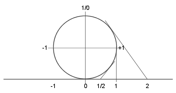 (Keine komplexe Zahlenebene.) Der untere Pol ist 0, der obere Pol 1/0.