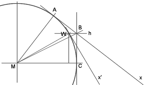 eine Hilfslinie (h) waagrecht auf den Kreis gezogen. Der Schnittpunkt (W) der Hilfslinie mit dem Kreis markiert den entsprechenden Winkel von √x (Berührungspunkt der Tangente x').